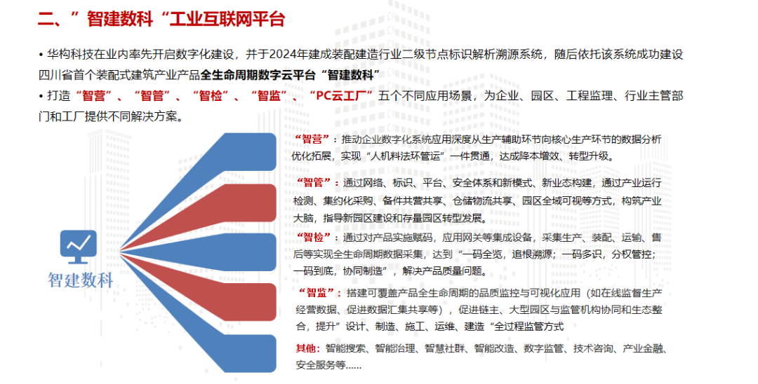 近年来,华构科技在高性能混凝土研究领域取得技术突破并实现落地应用,为转型开展奠定了基础,同时顺利获得持续调整传统房建业务占比、加大市政交通领域新产品研发、全力拓展新能源业务等举措,在行业调整期逐步走出了业务转型新路径。在数字化建设方面,华构科技顺利获得打造装配式建筑产业产品全生命周期数字云平台——“智建数科”,成功建设“智营、智管、智检、智监、PC云工厂”五大应用场景,实现自身智能化工厂升级的同时,为传统制造企业、产业园区、工程监理、政府及协会给予全生命周期数字化管理和一体化云供采服务,先后荣获了国家级国企数字场景创新三等奖、建材工业互联网示范项目。