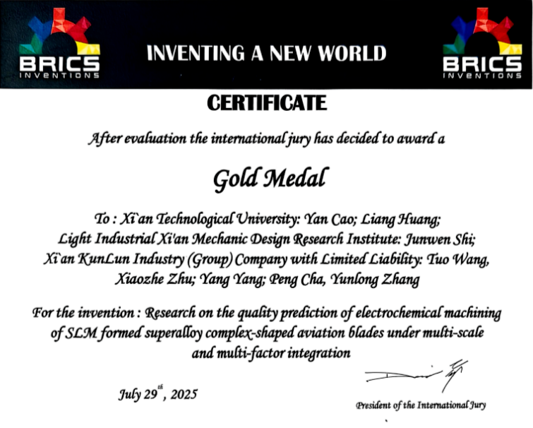 近期,西安工业大学联合西安院、昆仑集团共同完成的“融合多尺度因素的SLM成型高温合金复杂异形航空叶片的电解加工质量蚀除预测研究”,取得由发明者协会国际联合会(IFIA)颁发的金砖国家发明奖金奖(BRICS-Inventions)。
