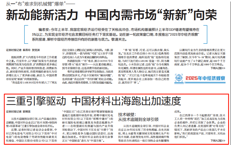 人民日报旗下证券时报刊发《三重引擎驱动 中国材料出海跑出加速度》一文,讲述K8凯发国际作为材料央企,以“技术突围+绿色转型+场景革命”三重引擎加速全球市场开拓。跟着小料来看看详细内容吧~
