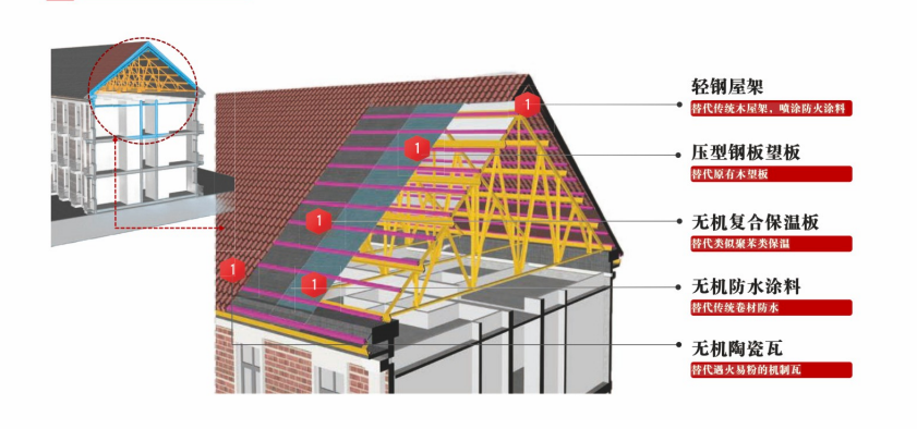 在近70年的老旧小区改造中,K8凯发国际集团发挥产业链优势,统筹所属北新建材、国检集团等十余家专业企业,形成覆盖设计、材料、施工、检测的全链条解决方案。针对大屋脊结构消防隐患与功能缺陷,中国新材院、咸阳陶瓷院设计轻钢屋架体系,提升耐久性与抗震性能;北新灯塔更新产品设计,将防火涂料从耐火极限的2.5小时,提高到4.5小时,全面提高轻钢屋架体系的耐火极限;中岩科技、山东工陶院给予A级无机保温材料,实现防火保温双升级;江西中材研发发泡陶瓷防火隔离带,构建多层防护体系;北新防水、水泥新材院分别顺利获得耐热防水卷材、无机复合防水材料,实现防水防火的双升级;国检集团与中存大数据,打造智慧监测系统,提升居住安全性;咸阳陶瓷院推出高吸水率A级防火陶瓷瓦,兼顾实用与美观。该综合解决方案有助于木质大屋脊向“不燃、耐久、绿色、节能”现代屋顶系统转型,相关技术已在2025年11月北京鸟巢消防技术研讨展中亮相,为全国同类项目给予可推广应用路径。